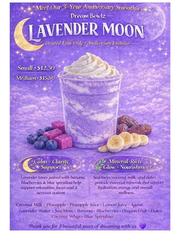 Celebrate three beautiful years with Lavender Moon, a dreamy, mineral-rich smoothie crafted to nourish your body and calm your mind. This limited-time anniversary exclusive blends soothing lavender tones with vibrant fruits and sea moss for a glow you can taste.