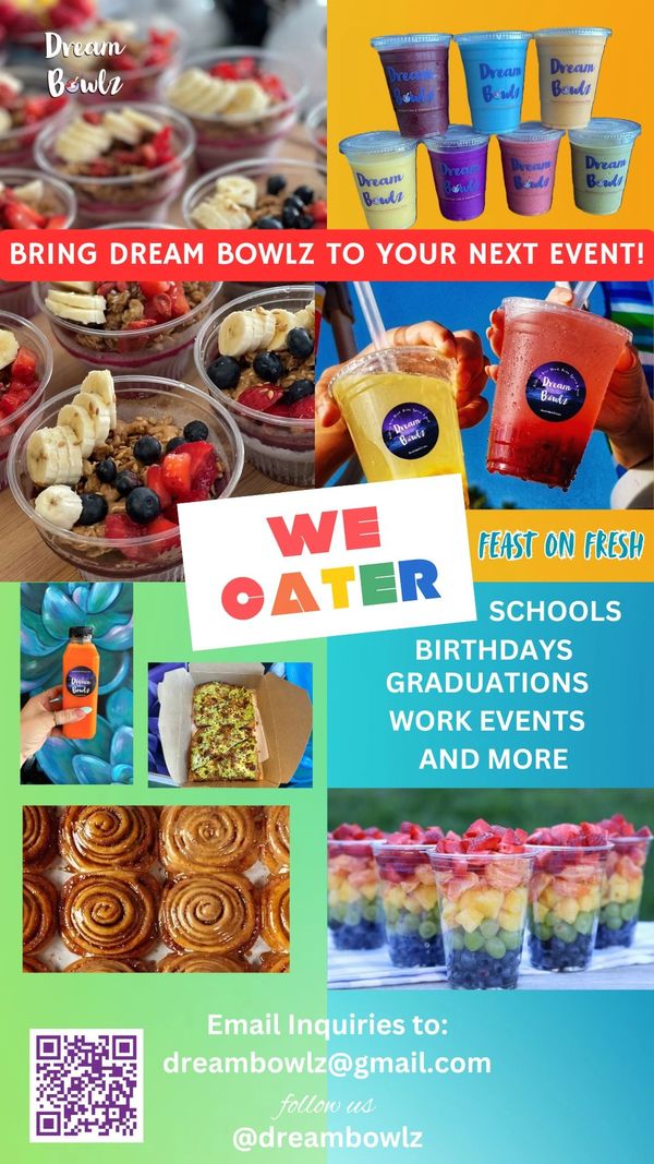 Bring the vibrant, feel-good flavors of Dream Bowlz to your next event! Whether you're hosting a corporate meeting, birthday celebration, wellness retreat, or any special occasion, our catering delivers nutrient-rich bowls, smoothies, and superfood treats that nourish both body and spirit.