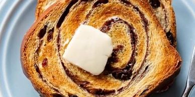 Toasted organic raisin bread with a rich cinnamon swirl, finished with a smooth, plant-based butter spread. Comforting, simple, and perfectly nostalgic.