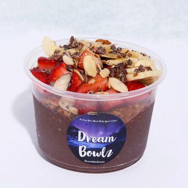 Topped with crunchy granola, raw cacao nibs, fresh strawberries, almond slivers, and a touch of raw honey —