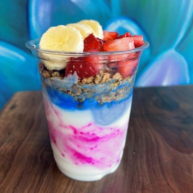 Creamy coconut yogurt swirled with antioxidant-rich açaí, layered and topped with crunchy granola, fresh strawberries, banana slices, and a drizzle of honey.