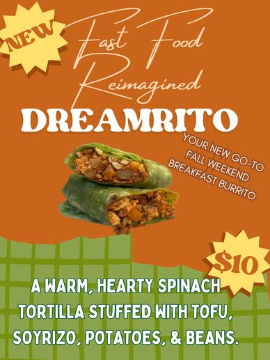 Start your weekend mornings right with the Dreamrito Breakfast Burrito — a warm, hearty, and flavorful twist on fast food. Wrapped in a vibrant spinach tortilla, this plant-powered burrito is packed with tofu, soyrizo, potatoes, and beans, delivering a satisfying bite in every mouthful.