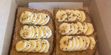 Toasted multigrain bread topped with creamy peanut butter, fresh banana slices, a sprinkle of flax seeds, and a drizzle of golden honey.